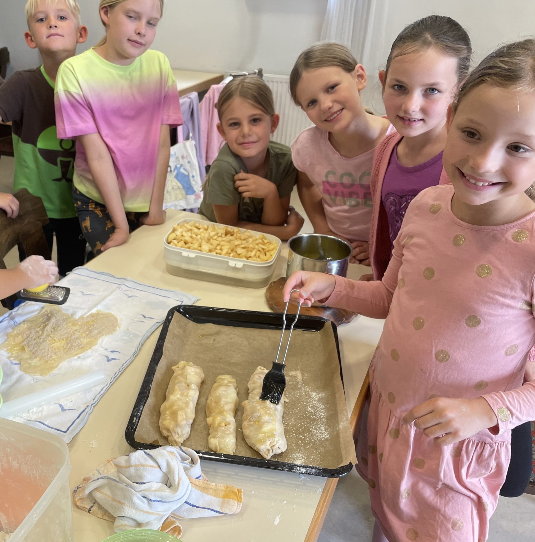 Nach dem zweiten Dessert wurde der fertige Apfelstrudel aus dem Ofen geholt und gleich in die mitgebrachten Schüsseln verpackt. Wir wünschen den Kindern viel Spaß beim Nachbacken und hoffen, alle Kinder auch bei unseren nächsten Programmpunkten wiederzusehen.