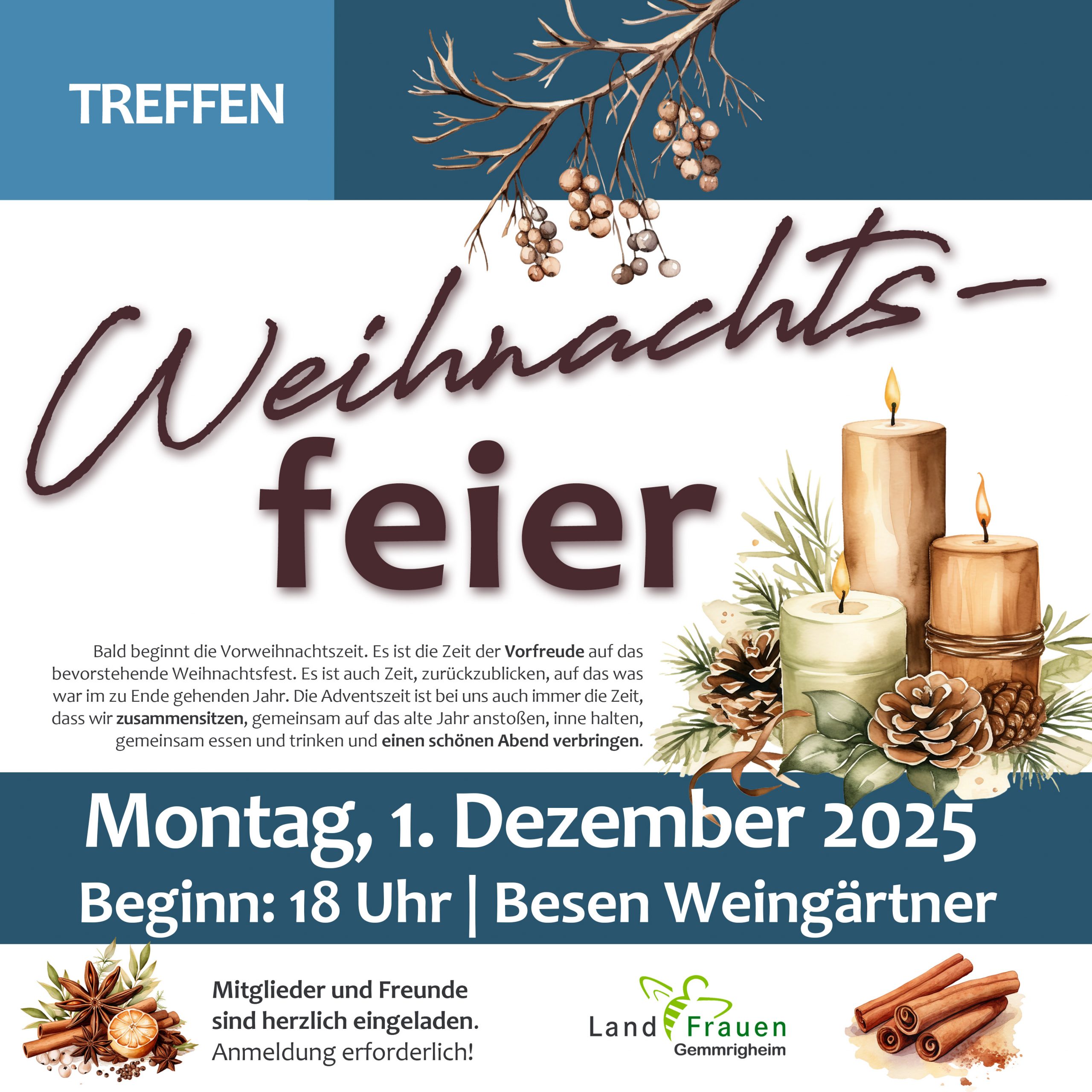 Carina Weingärtner wird für uns ein leckeres Buffet mit Vorspeise und Dessert vorbereiten. Zu Beginn gibt es einen Begrüßungssekt. Das Essen (Buffet 25 €/Person) sowie die Getränke bezahlt jeder vor Ort selbst. Gerne erbitten wir Ihre Rückmeldung bis spätestens zum 20.11.2025 entweder telefonisch bei Sabine Appich, Tel. 0175 5589230, oder per E-Mail an kontakt@landfrauen-gemmrigheim.de.